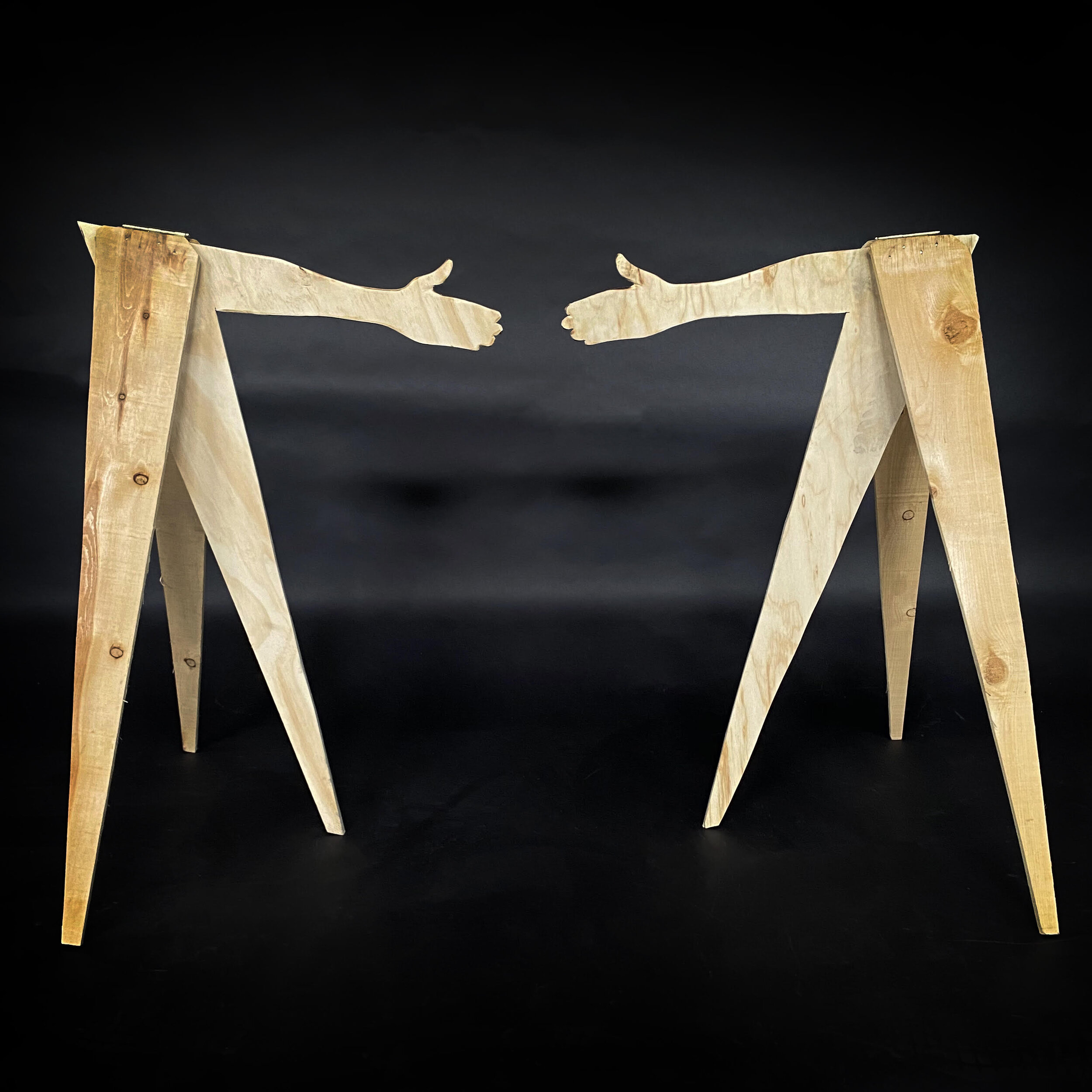 Five wooden handshakes — made from the fence boards that once divided two homes.