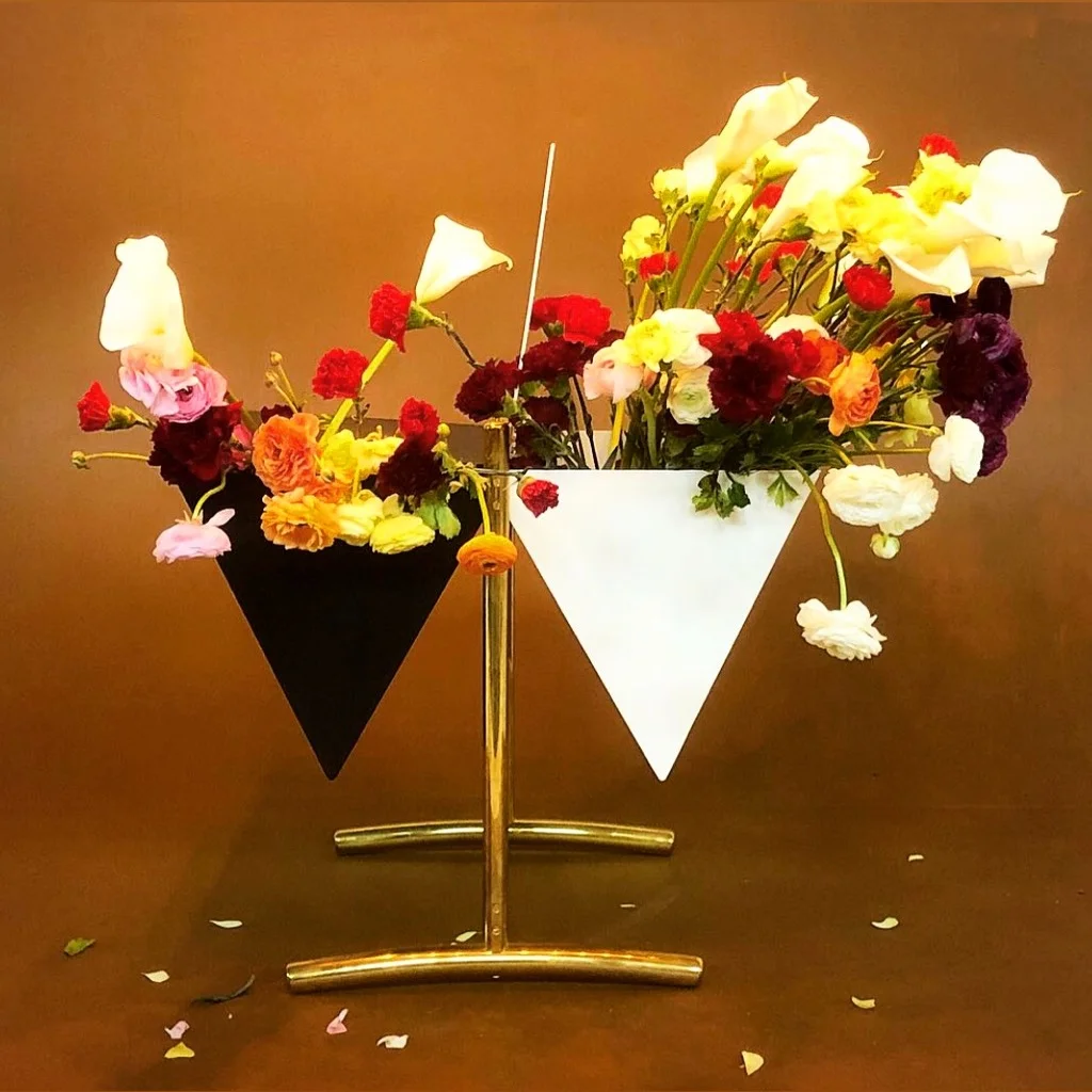 A solid polished brass bar table with two opposing triangular aluminum case boxes. Each table top opens to reveal a storage compartment sized to hold books, magazines or record albums. Shown in black, white and polished brass. Custom powder coat or plating available for additional cost. Designed and handmade by Jason Koharik, 2016.